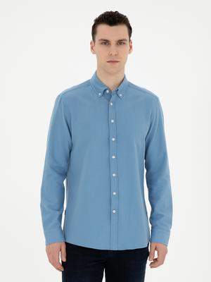 - Açık Mavi Keten Karışımlı Regular Fit Uzun Kollu Gömlek