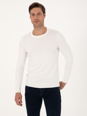 Ekru Slim Fit Bisiklet Yaka Basic Triko Kazak