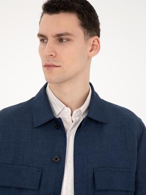 Lacivert Regular Fit Keten Karışımlı Düğmeli Ceket