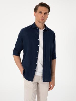 Lacivert %100 Keten Regular Fit Uzunkollu Gömlek